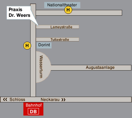 Die Straßenbahnhaltestellen "Rosengarten" und "Nationaltheater" sind etwa 150m von unserer Praxis entfernt.